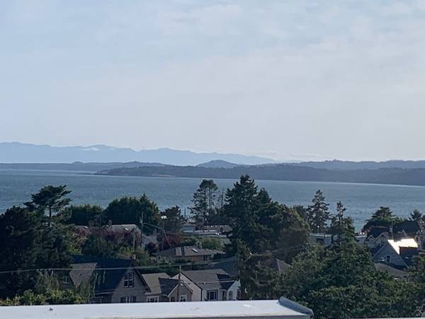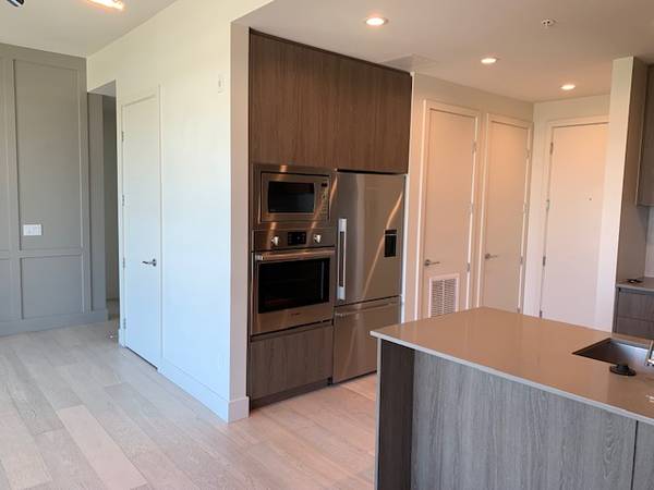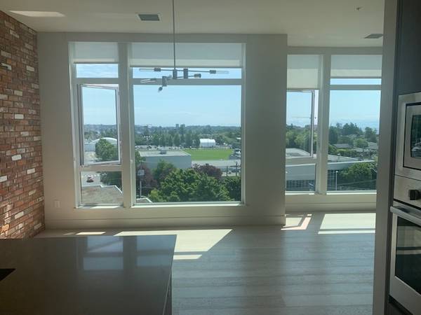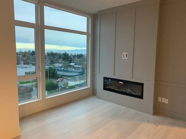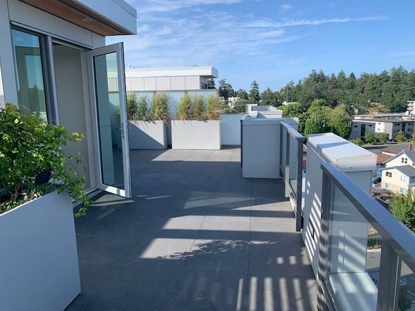 The Arbutus at Esquimalt Town Square, by Aragon Properties. This bright 1 bedroom with office nook, has extensive water and city views from the main level and private rooftop patio. It has 9’6” ceilings, expansive windows throughout. Interiors feature custom built-ins through-out, wide-plank oak engineered hardwood floors, premium appliance pkg ft Fisher & Paykel, Bosch wall oven, gas range, and dishwasher, Benson custom cabinetry, full size LG washer and dryer. The living room features locally sourced brick feature wall as well as built in designer panels with electric fireplace. NU-Heat in ensuite. Features a stunning private 750 sf rooftop patio with outdoor kitchen, complete with BBQ, fridge and sink, glass-covered trellis and watering system for plants.