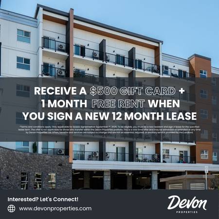 Promotion: Receive a $500 GIFT CARD + 1 Month FREE RENT When You Sign a New 12 Month Lease *