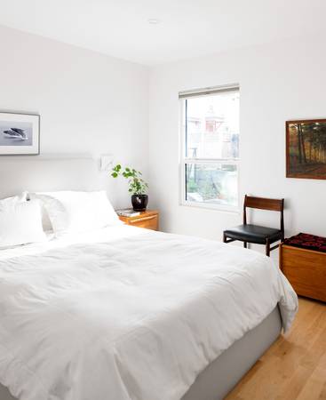 Home features a fully equipped kitchen with garden-fresh greens, a cozy gas fireplace with reclinable leather chairs, and high-speed internet for work or streaming. Enjoy piano music, abundant natural light from skylights, and a choice between the infrared sauna or a deep soaking tub before bed. Each floor offers its own bedroom and bathroom for comfort and privacy, both with organic latex and wool queen beds and Toto washlets.