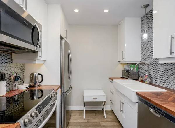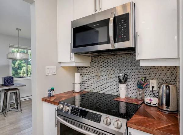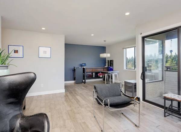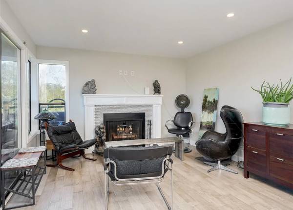 Welcome to a beautifully renovated top-floor corner suite in a quiet, well-cared-for 10-unit building. This home feels fresh and modern with a soft colour palette and birch engineered hardwood floors. The living room is warm and inviting with a wood-burning fireplace and access to a west-facing balcony where you can enjoy evening sunsets. The kitchen offers bright white cabinets, wood-style counters, stainless appliances and a dining area surrounded by windows. The primary bedroom overlooks the nearby park and includes a walk-in closet with organizers. The bathroom has thoughtful tile details, in-floor heating, and natural light from a skylight. You’ll also find in-suite laundry, a tucked-away office nook, and secure parking. With natural light throughout and a location close to green space.