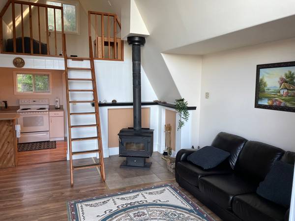 Enjoy stunning views of the Olympic Mountains and Strait of Juan de Fuca from less than 10 minutes outside the town of Sooke. The open-concept kitchen/living/dining layout is ideal for cooking and relaxing together. The cozy woodstove keeps you warm on cold nights while the sliding doors leading to the deck are the perfect place to catch the summer sun. The master bedroom boasts a luxurious king-size bed and the second bedroom comes equipped with a queen. A full bathroom is located conveniently in the hallway. The bonus loft area is ideal for enjoying a good book.