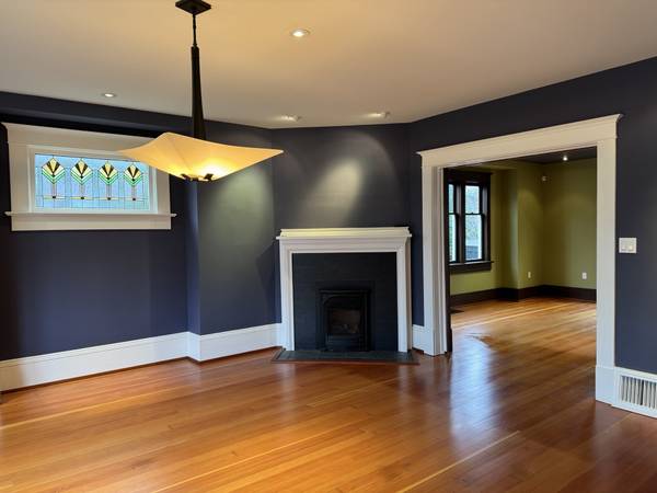 Inside, enjoy a gourmet kitchen with high-end appliances, a huge island perfect for entertaining, and French doors leading to a private, low-maintenance garden and deck. The connected living and dining areas, complete with pocket doors, high ceilings, two gas fireplaces, and leaded glass windows, make it a warm and inviting space for gatherings.