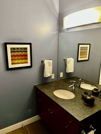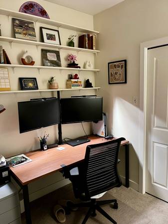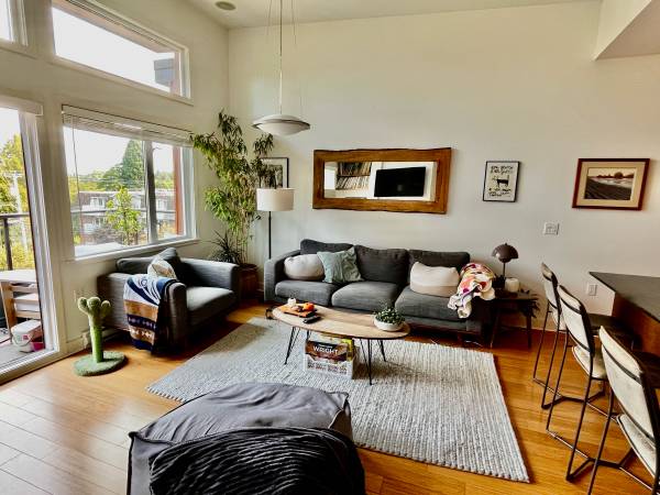 Spacious 848 sq ft top floor unit near UVic, high ceilings, 1 bedroom and walk in closet, 1 den/ office with large closet, 1 full bathroom with bath/shower, plus half bathroom, in suite laundry, entryway and coat closet. Large outdoor deck.
