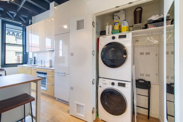 Building amenities include a gym, and rooftop deck with barbecue, providing stunning city views. The location is incredibly convenient.