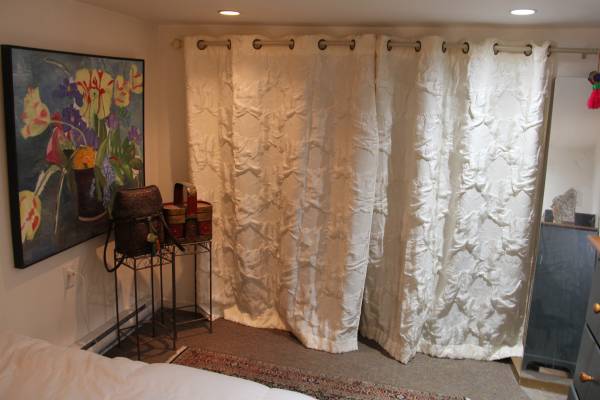 Apt includes laundry/storage room, bathroom, one long room containing kitchen, dining and living room. Pocket doors lead to the bedroom with huge and long curtained closet.