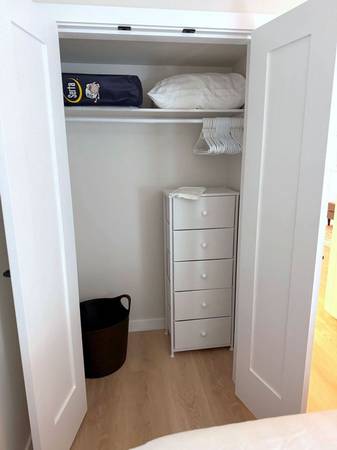 The master bedroom has a queen size bed and a large closet. The bathroom has a tub/shower combo with a large showerhead.