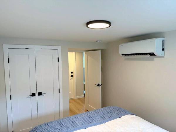 Private in-suite washer and dryer, and ample free street parking. Heat pump with air conditioning for your comfort.