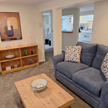 Elegant, furnished open-concept apartment in the heart of desirable Fairfield, a block from the Dallas Road waterfront. Two bedrooms situated for maximum privacy on either side of a living room that includes a gas fireplace. On a bus route, the apartment is fully supplied with sheets, towels, dishes, pots, cutlery, kettle, coffee maker, toaster, iron, hair dryer, new vacuum cleaner, and wi-fi. A flatscreen TV is also available for those with accounts with Netflix, etc. The apartment is ground level and has two private entrances and a deck for outdoor dining or simply hanging out. Designed to take advantage of the sun's light, the space is naturally lit throughout the day.