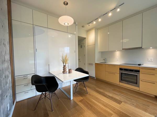 This wonderful second-floor, north-facing studio is fully furnished in a modern style. The exposed concrete and natural white oak floors are outmatched only by the view. The unit enjoys brand new high-end furnishings from Bludot, gorgeous street art by Shepard Fairey, and an easily convertible murphy bed/dining room table combo with a gorgeous pendant light that will surprise and delight you.