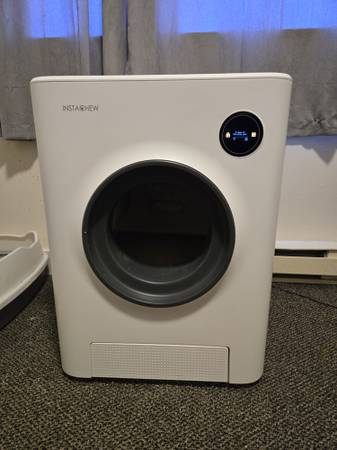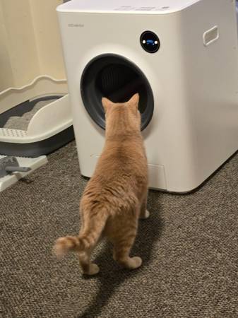 Quiet, self-cleaning kitty box for multiple cats. Had for a month, but 1 of my 2 cats won't use it. It's a fantastic machine and I highly recommend it to anyone interested. No smells, super quiet, down-loadable app. Comes with odor can unopened and bags. Go to Instachew Purrclean for dimensions and more information.