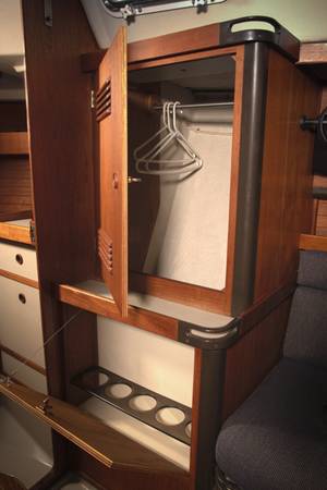 large refrigerator box, propane range, lots of storage, Port and Starboard settees with centre