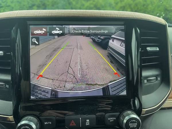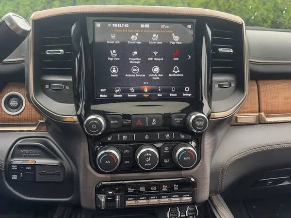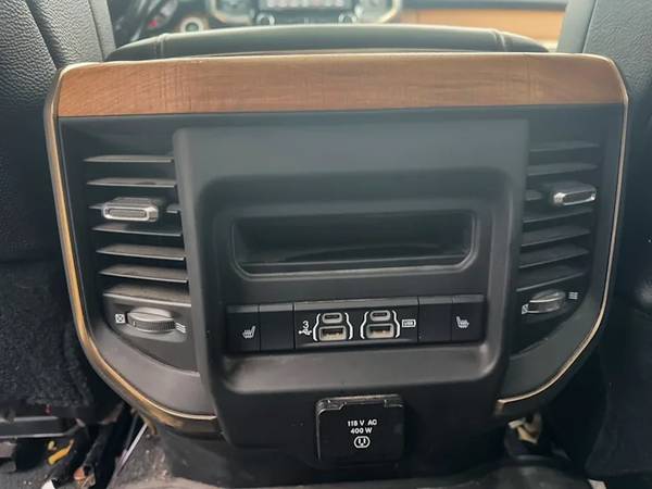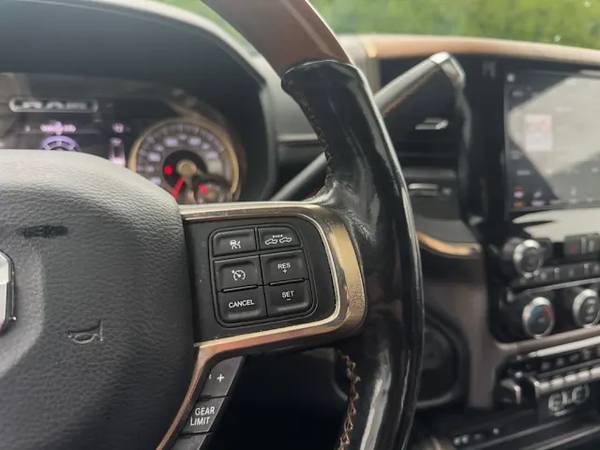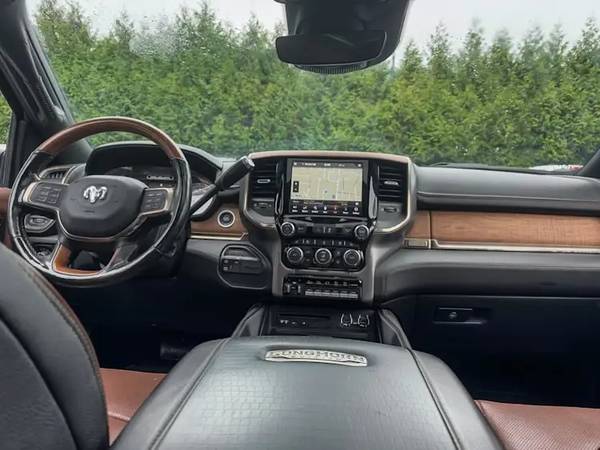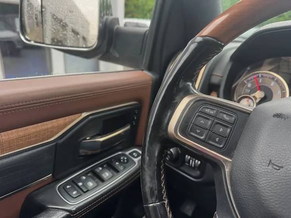 Our 2019 Ram 3500 Laramie Longhorn 4x4 Crew Cab features UConnect 4C NAVIGATION, BACK-UP CAMERA, POWER SUNROOF, LEATHER HEATED/VENTED FRONT SEATS, : 6.7L Cummins I-6 HO turbocharged diesel engine, power driver seat, a leather wrapped steering wheel, Bluetooth, a/c with dual zone temperature control, rear 60/40 split folding seat, rear power sliding windows, Safety Group with Forward Collision Warning with Active Braking, Adaptive Cruise Control with Stop, Blind-Spot and Cross-Path Detection (Truck only); Protection Group with Transfer case skid plate; Max Tow Package with 5th Wheel & Gooseneck Towing Prep Group, 4.10 rear axle ratio, Centre high-mounted stop lamp with camera, Rear auto-levelling air suspension, Mopar 30K direct mount 5th wheel hitch; Dual rear wheels, Dual alternators rated at 440 amps plus more!