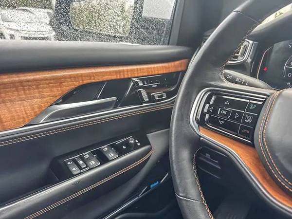 This 2022 Jeep Wagoneer Series III has a 6.4L V8 engine and features with Quilted Palermo leather-faced bucket seats, Massaging Driver/Front Passenger seats, heated/ventilated front seats, heated/ventilated 2nd row seats, heated steering wheel, a/c with four zone temperature control, Sirius XM Traffic and Travel Link, Uconnect 5 NAV w/ 12-inch display plus 12.3-inch TFT colour display cluster, power dual-pane sunroof, McIntosh MX1375 Entertainment System with 23 speakers, Apple Carplay & Google Android Auto; Rear-Seat Entertainment Group with Seatback video screens and USB video ports; wireless charging pad, 3rd-row power seat 60/40 recline, Quadra-Lift air suspension, Adaptive damping suspension, Selec-Terrain Traction Management System, Active Lane Management System, Adaptive Cruise Control w/ Stop & Go, Blind-Spot Monitoring and Rear Cross-Path Detection, Full-Speed Forward Collision Warning Plus, Universal garage door opener, Heavy-Duty Trailer-Tow Package, 22x9-inch aluminum painted wheels and so much more.