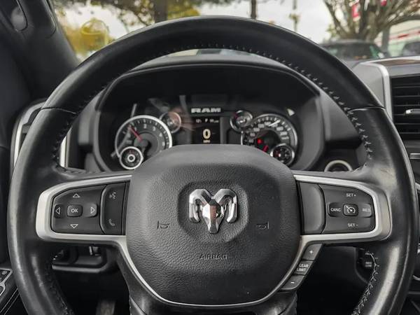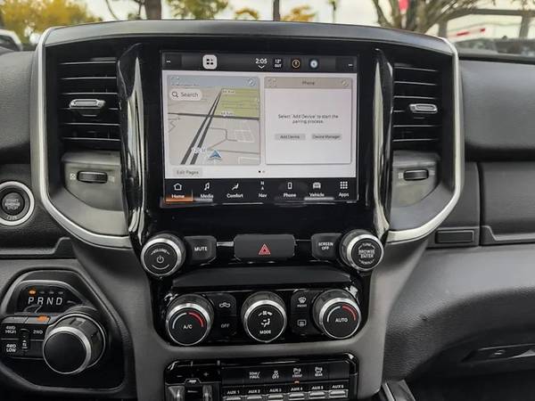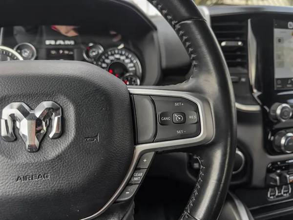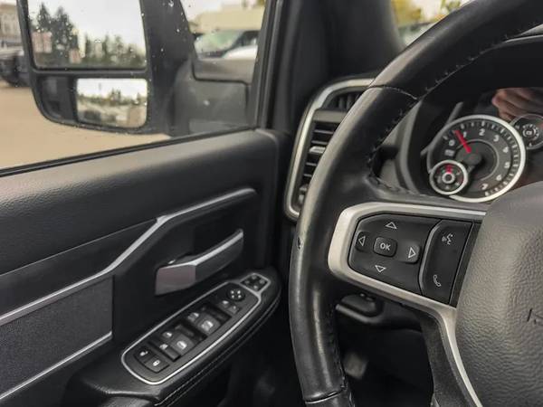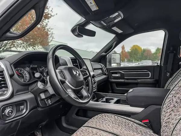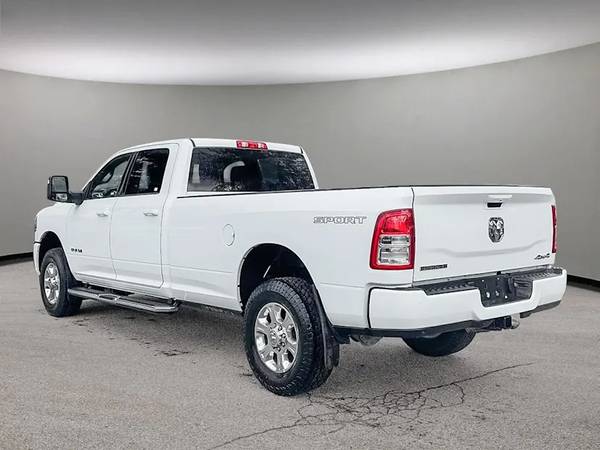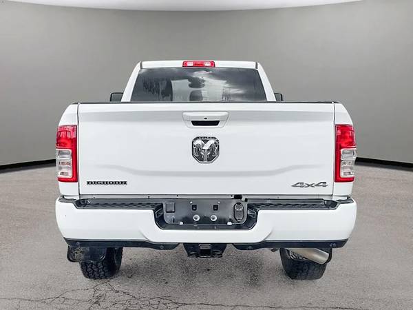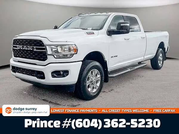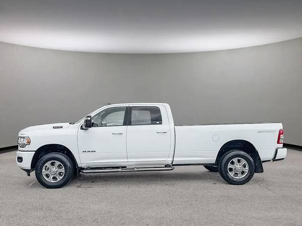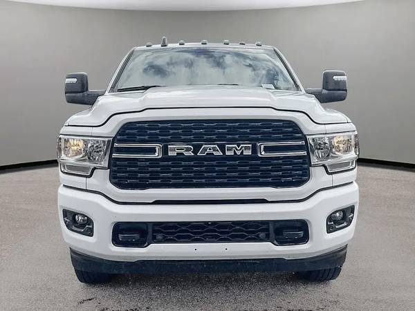 Shown in Bright White, this 2023 Ram 3500 Big Horn Crew Cab 4x4 features premium cloth seats, UCONNECT 5 NAVIGATION with 8.4-inch display, HEATED FRONT SEATS, LEATHER/HEATED STEERING WHEEL, APPLE CARPLAY/GOOGLE ANDROID AUTO, POWER 8-WAY DRIVER'S SEAT, power adjustable pedals, a/c with dual zone temperature control, cruise control, Bluetooth, push button start, rear window defrost, automatic headlamps, class V hitch receiver, a remote starter, Instrument panel-mounted auxiliary switches, Clearance lamps, Bright flat cab-length side step, Sport Appearance Package, Big Horn Level 1 Equipment Group, a back-up camera, front and rear park assist and even more.