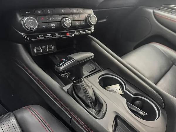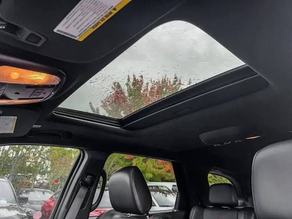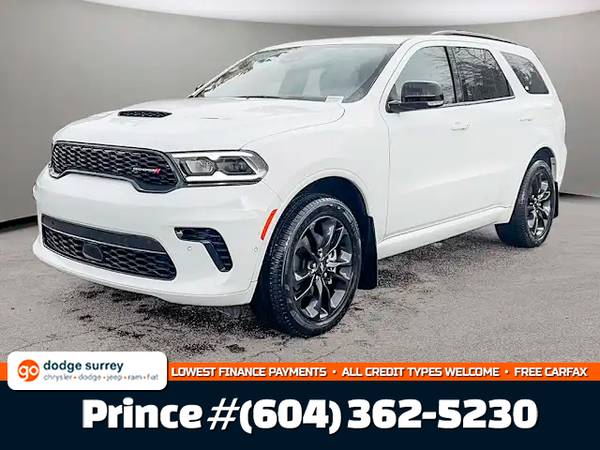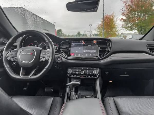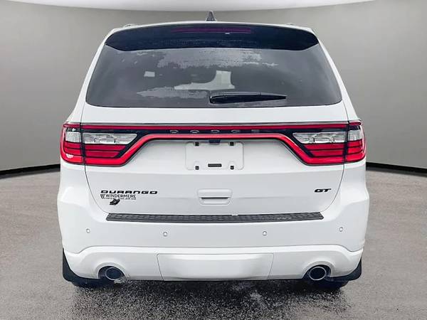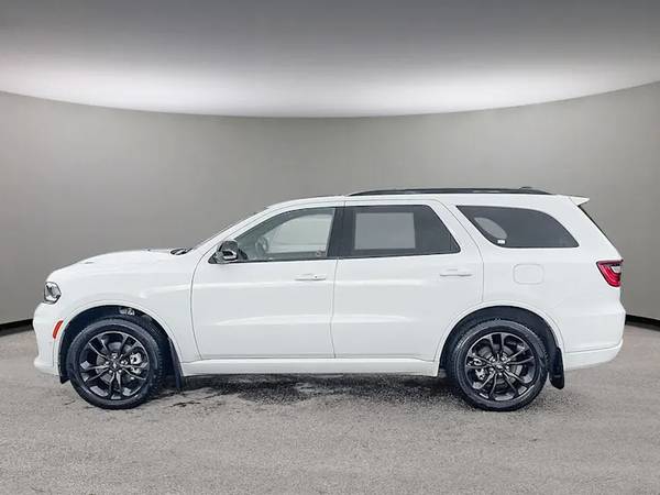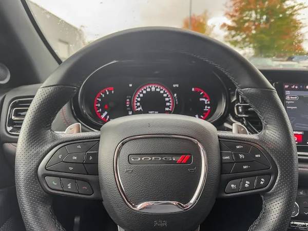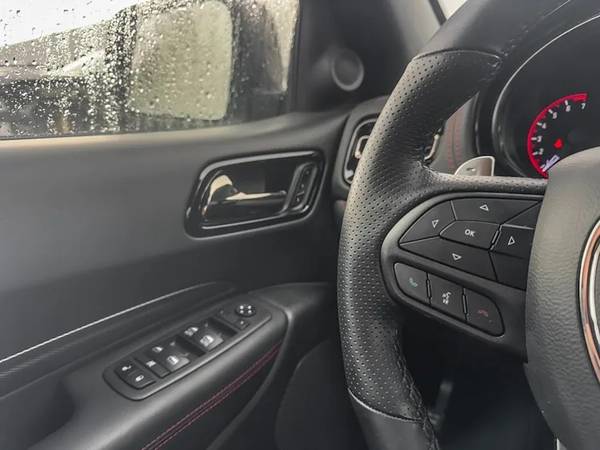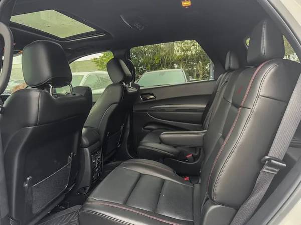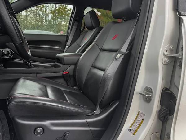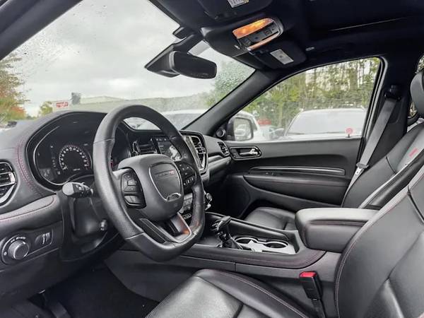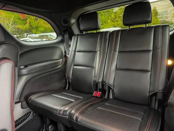 With easy to clean leather heated front and second row seats, Uconnect 5 NAV with 10.1-inch display, Bluetooth, rear park assist with a reverse back-up camera, leather wrapped and heated steering wheel, power 8-way driver memory settings and 6-way passenger power seats, power sunroof, cruise control, tri- zone temperature control, Blacktop Package with 20x8-inch Black Noise aluminum wheels, Satin Black Dodge tail lamp badge, Performance hood, Gloss Black GT badging, keyless enter n' go, remote starter with a security alarm, Wireless charging pad, universal garage door opener and tons of cargo room with the ability to seat up to 7 passengers this well maintained Durango is perfect for all your vacation needs!