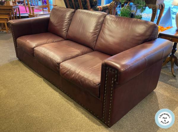 Find this striking high end burgundy full grain leather 3 seater sofa from Jaymar for only $1500.00 at Charmaine's Past and Present! We are located at 1083 Fort St. (just before Fort St. reaches Cook St.) and are open from 10am-5pm Monday through Saturday, so don't hesitate to come by the shop for a closer look, give us a call at show contact info