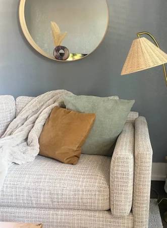Modern 3-Seater Sofa – Great Condition Stylish light-beige fabric sofa with a sturdy wooden base and plush seat cushions. Comes with four decorative throw pillows. Comfortable, contemporary, and...