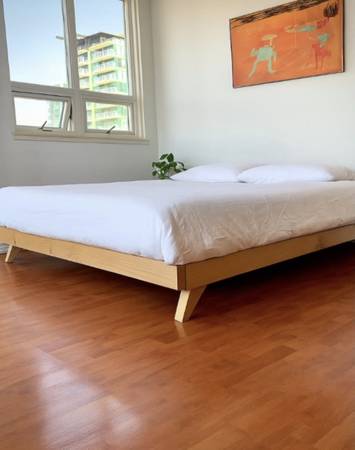 Solid alder platform bed with a simple, modern profile. No headboard on this one — just a clean, sturdy frame built to be quiet and long-lasting.