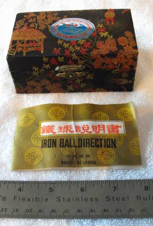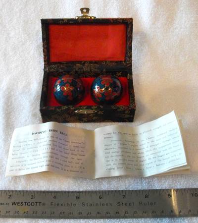 Bought this during my tour to Beijing China in the 90s. These are Baoding balls, also known as Chinese exercise balls or Chinese health balls. They are used for physical exercise and therapy by rotating them in one hand. Baoding balls are believed to improve finger dexterity, relax the hand, and aid in the recovery of muscle strength and motor skills. The practice dates back to the Ming dynasty. According to traditional Chinese medicine, rotating the balls stimulates acupressure points in the hand, which are connected to the central nervous system and vital organs. The balls often contain chimes that produce a pleasant melody when rotated, which can aid in meditation and stress reduction. PLEASE NOTE: Thank you for looking at my post. I check my emails 1-2 times daily, but may be delayed due to my disabilities, which require me to visit hospital. The exchange must be in-person, with cash, at pre-arranged pick-up at my location. If your out of the area, please have family, friend, or arrange courier service to pick-up on your behalf. Hope to hear from you soon.