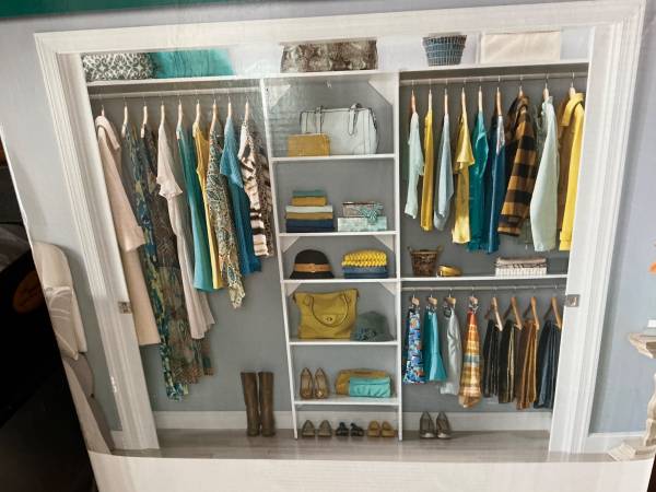 Closet organizer: make better use of the space in your closet with this package of shelving and rods for handing and storing clothes and accessories. In unopened box; new