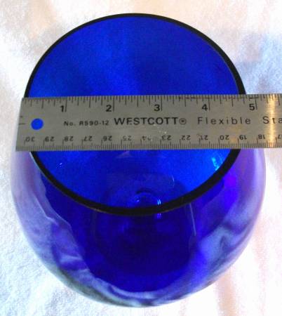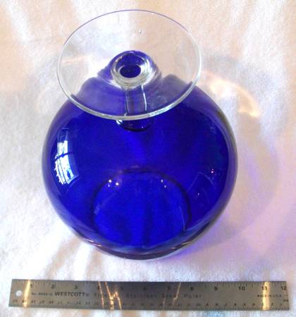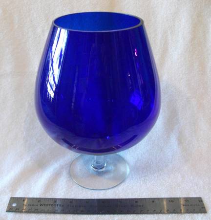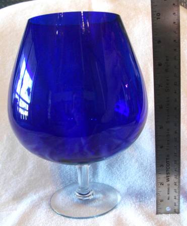 Bought this wonderfully huge Vintage Cobalt Blue Brandy Snifter. Saved on refilling trips… (JOKING). No….really, found at an antique shop about 20+ years ago. Was part of my extensive blue glass collecting phase. Would be a great centre-piece with flowers, filled with candy, or used to actually “sip” brandy. Size: 10.5” Tall with 4.75” tapered opening. Condition: Have a few minor air-bubbles and flaws. PLEASE NOTE: Thank you for looking at my post. I check my emails 1-2 times daily, but may be delayed due to my disabilities, which require me to visit hospital. The exchange must be in-person, with cash, at pre-arranged pick-up at my location. If your out of the area, please have family, friend, or arrange courier service to pick-up on your behalf. Hope to hear from you soon.