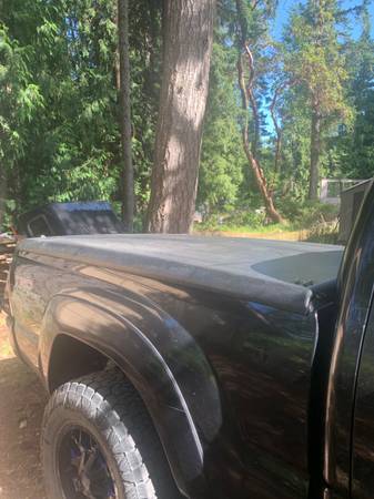 Tonneau cover. Fits 6’ truck bed (was on a Tacoma). Locks need replacing and there is a small crack in the front end (covered w/ gorilla tape has sealed out wet). Need to have your own rails/tracks...