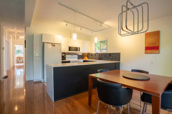 Welcome to 1376 Craigflower Rd. A Mid-Century Gem Reimagined. This fully renovated, single-level mid-century modern home blends timeless architecture with modern comfort in a park-like setting. The open layout features high ceilings, a central beam and large windows framing landscaped gardens. Enjoy a sleek kitchen with quartz counters, new dishwasher, and over-counter lighting. The main bath includes double sinks, towel warmer, and ambient lighting; a powder room houses stacked laundry. Two bedrooms plus a large flexroom/bedroom/office. A propane fireplace, oil furnace, and central vac offer year-round comfort. Outside, three cedar decks, curated plantings, and water features create a garden retreat with drip irrigation and evening lighting. Unique outbuildings include a music/art studio, garden studio, and enclosed workshop. Minutes to downtown Victoria, trails, the Gorge Waterway, and transit—this home offers inspired living in a serene, convenient location.