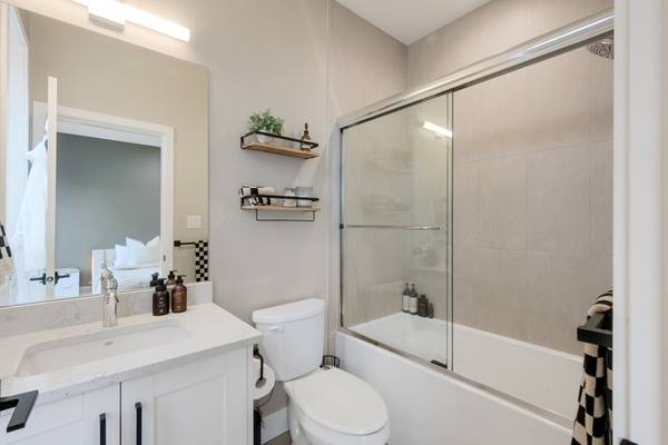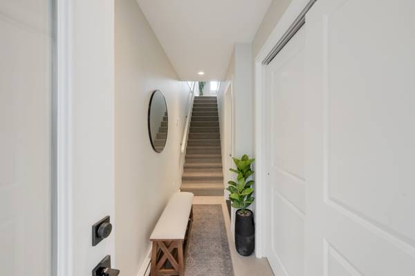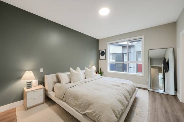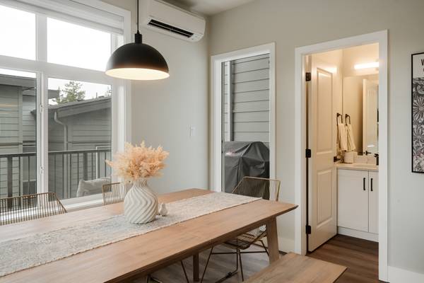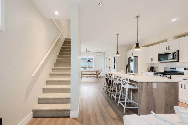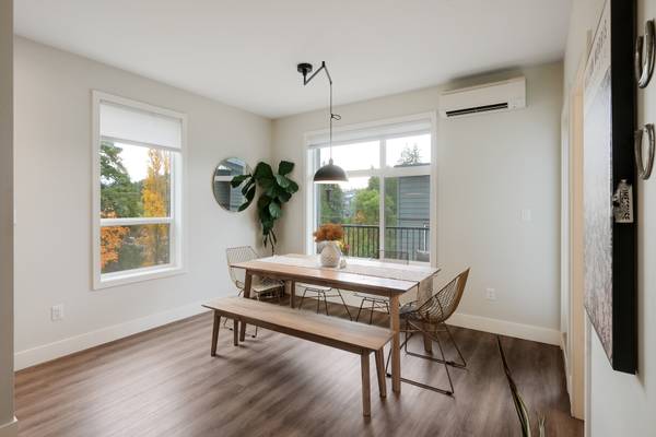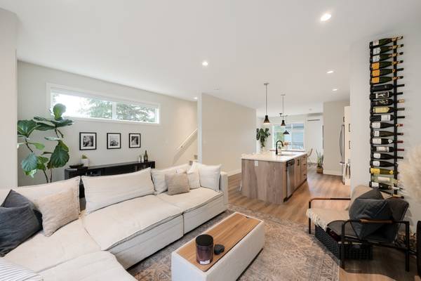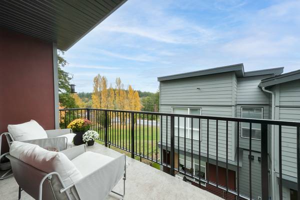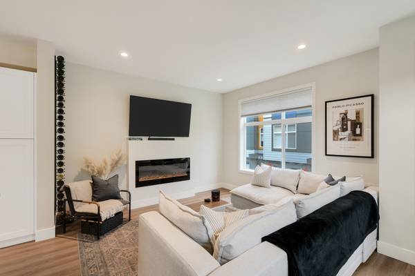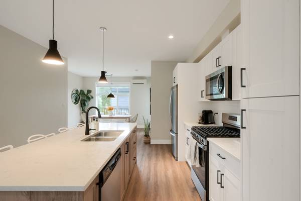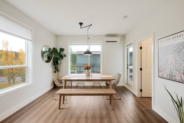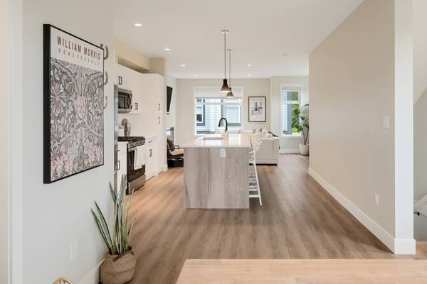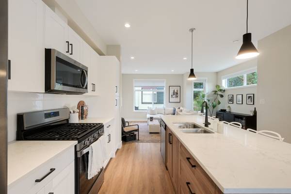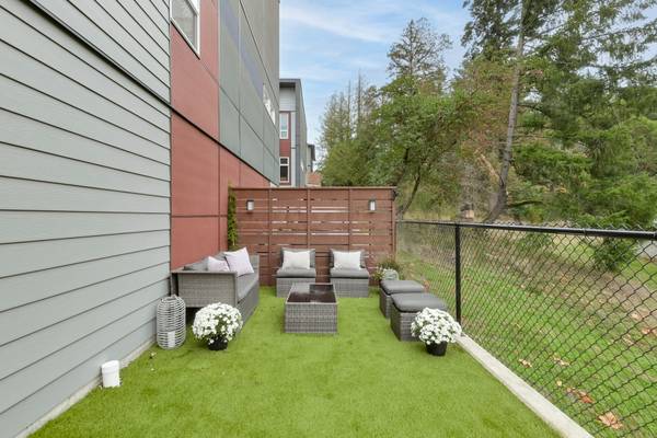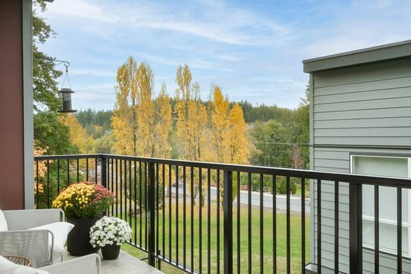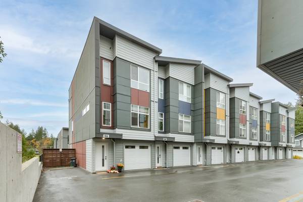 Beautiful 2023 built prime end-unit corner townhome on Triangle Trail near Olympic View golf course. Impeccably presented with over 1400sf on 3 levels plus double depth garage for vehicle storage or gym/workshop. Open layout on the main with living room, spacious kitchen with quartz counters, stainless appliances and abundant cabinet space plus dining area and access to deck overlooking the surrounding area. 3 bed rooms up, primary with ensuite and plenty of light from the large windows. Heat pumps for efficient heating and air conditioning. Bonus huge wraparound patio- your own fenced yard unique to this unit in the development. Great location near brand new Scianew Stelitkel Elementary School along with Red Barn Market, the galloping goose trail and Royal Bay nearby.
