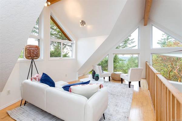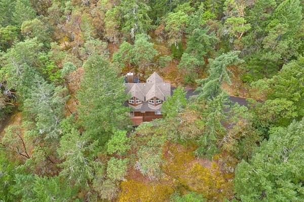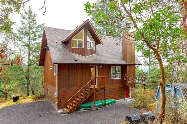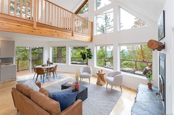 This bright and inviting 2005 custom cedar home was thoughtfully built to preserve nearly 4 acres of pristine natural woodland—a true hidden gem in the Eastern Highlands, featuring a NEW heat pump, surrounded by majestic arbutus and Douglas fir, yet only minutes from amenities. To protect the native flora and fauna, the owners commissioned a dedicated Landscape Restoration Plan, ensuring the land remains in harmony with its natural setting. Perched on a gentle rise and designed with an expansive wrap-around, south-facing deck, and vibrant sunsets. Inside, floor-to-ceiling windows flood the principal rooms with light while showcasing the vistas beyond. The open-concept layout features gleaming maple hardwood, soaring vaulted ceilings with striking exposed beams, and a stunning river-rock fireplace with an energy-efficient wood-burning insert. A rare blend of modern comfort and natural beauty, this home offers peace, privacy, and the essence of a true private retreat. Also NEW Driveway