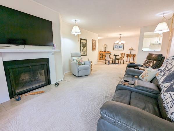 Lovely 2 bedroom, 2 bath condo situated on the QUIET side of this well-run 55+ age restricted strata building! Spacious (1178 sqft), bright and well maintained! Great layout offering a large open kitchen, spacious living room with dining area, plus an additional area that could be a home office/den space, and an extensive balcony overlooking greenery. Master bedroom with an ensuite bathroom. Features include insuite laundry with oversized washer and dryer, new S/S appliances (fridge, stove, dishwasher), wood burning fireplace, common area meeting room, bike storage, car wash area and underground parking stall, plus guest parking. Gorgeous new landscaping project recently completed along with the parking membrane and 2 newer elevators. Located just a few steps away from Hillside Mall, recreation nearby, and transit right outside your front door. Rentals allowed.