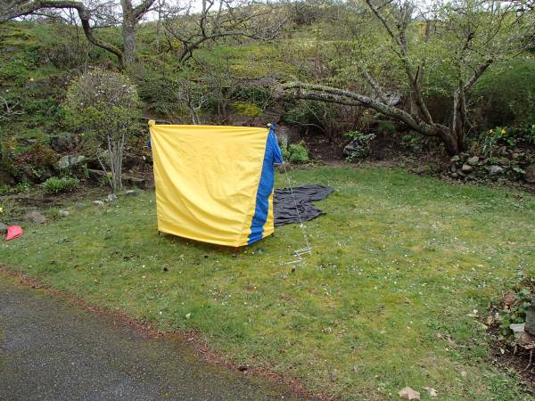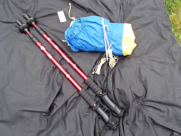 Also known as a "boothy"...used for quickly getting out of a snow storm or wind while taking snack break. Drizzle resistant not waterproof (unless you coat it with a waterproofing, which can be sprayed on and is very easy to do). Can accommodate 2-people sitting up against their backpacks. Erected by hanging from a rope, with crossed skis, or a pair of hiking poles (as in photos). 2 vents. Never used. Could be part of your emergency kit. Folds up very small and ultralight (1 lb). Comes w/ 2 guy lines and slider + 2 pegs (hiking poles excluded!).