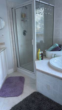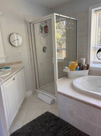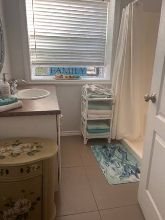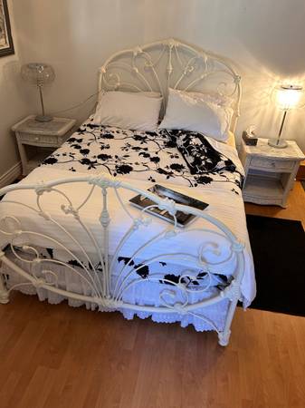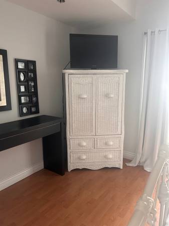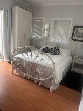 The primary queen bedroom with 9’ ceiling, has large makeup table and mirror, wicker armoire, wicker end tables, glass lamps,large Tv. Insulated blackout white draped French Doors lead to the attached Ensuite with walk in shower, and separate soaker tub.