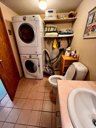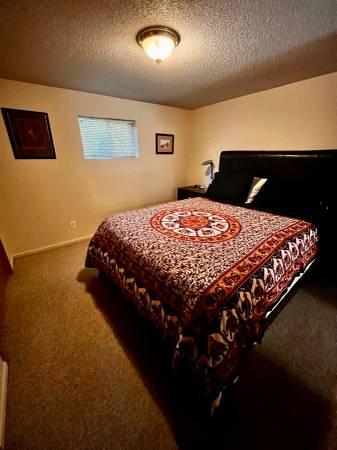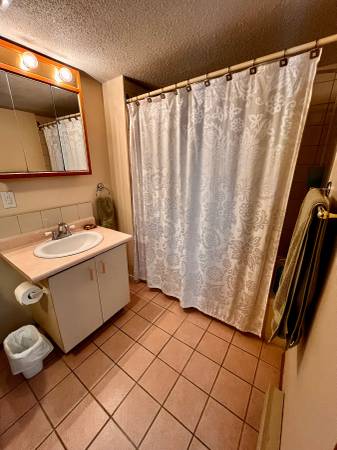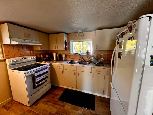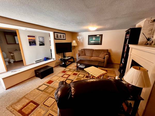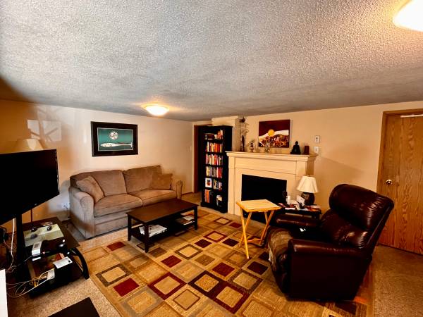 Furnished 1000 sq ft suite, with queen bed, plus den w single bed, living room with gas fireplace, full kitchen, bathroom with tub/shower and washer/dryer, sitting area in entrance.