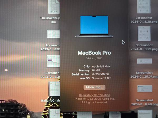 Gently used MacBook Pro M1 Max (fall 2021) for sale. 64GB of RAM, 1TB hard drive. Liquid Retina display. (see photos). This was my workhorse machine for a few years, hence the stickers on the back...