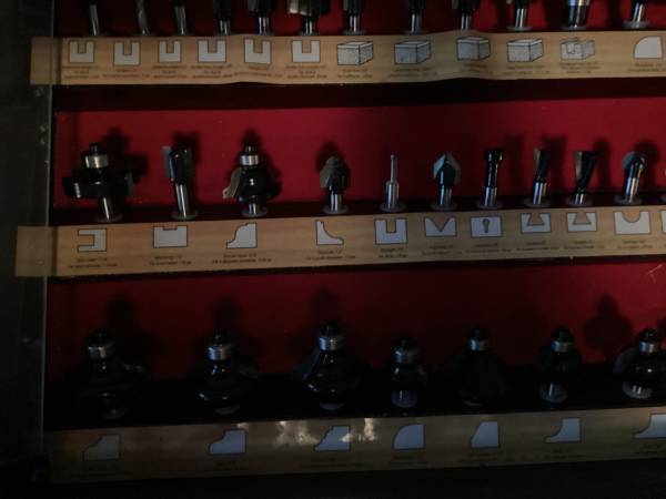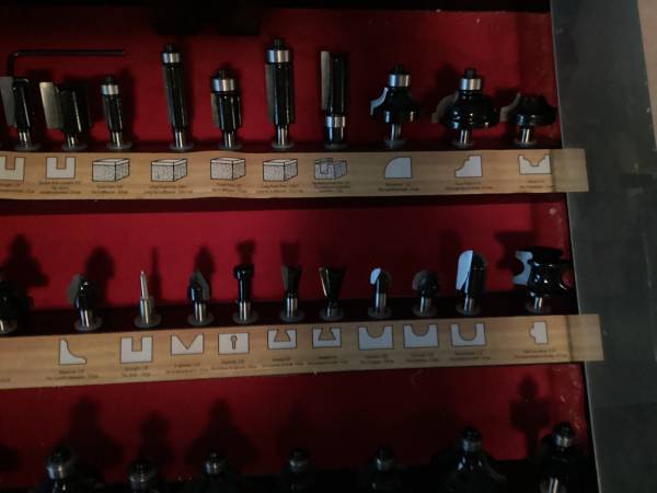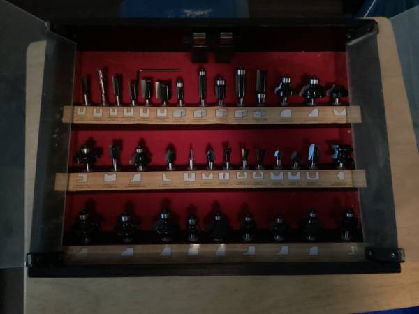 A set of 36 router bits in a display case with touch latch doors with 1/4” shanks